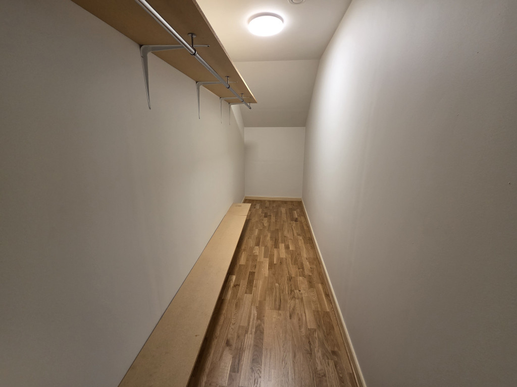 Ett rofyllt sovrum, även det med parkettgolv. Direkt från hallen nås en stor och praktisk walk‑in‑closet, perfekt för kläder, förvaring eller som dressing room.