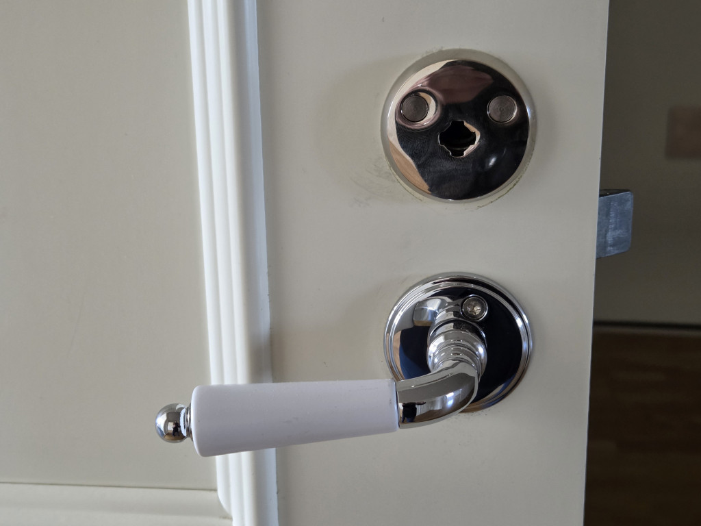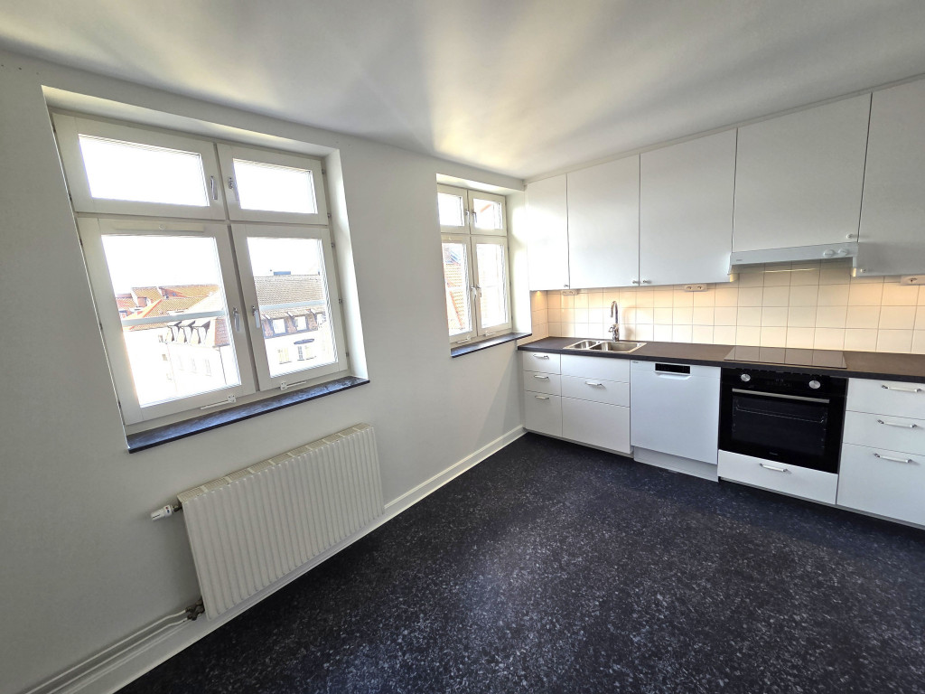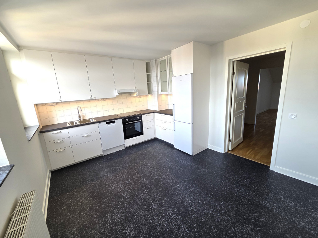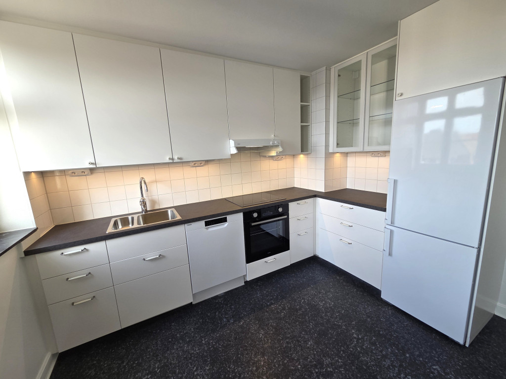 Köket är nybyggt 2025 och erbjuder modern vit inredning, generösa arbetsytor och nya vitvaror. Ljusinsläppet gör det till en plats där matlagning och socialt umgänge känns lika naturligt.