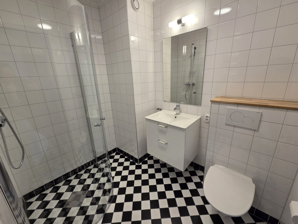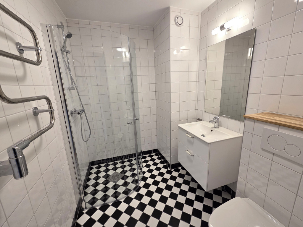 Badrummet, även det byggt 2025, är stilrent och genomtänkt med väggar i kakel och elegant svart/vit rutig klinker på golvet, ett badrum där estetiken möter funktion.