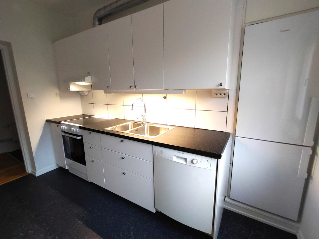Köket har vit ny (2024) köksinredning och en mindre matplats.