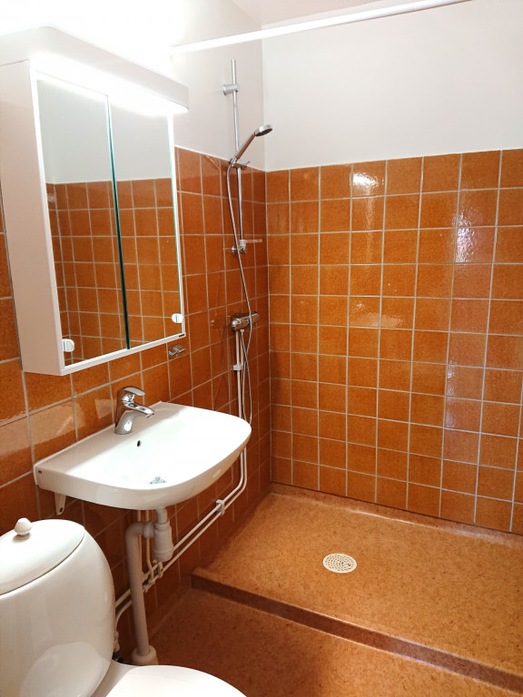 Duschrummet är fräscht och praktiskt utformat med beigt plastgolv och delvis kaklade väggar, vilket ger en lättskött och inbjudande känsla.