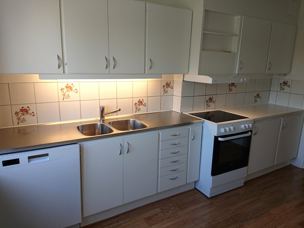 Köket har vit inredning, med slitstarkt laminatgolv. Det erbjuder en perfekt miljö för både vardagsmatlagning och trevliga middagar med vänner och familj.