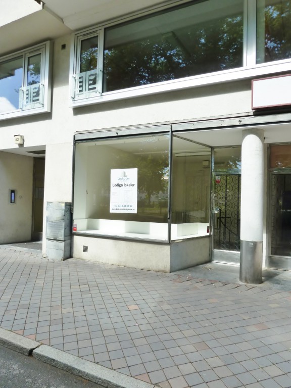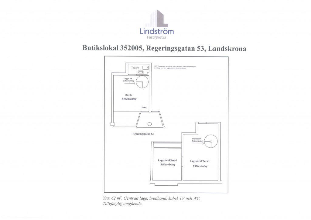 Lokalen består utav ca. en tredjedel butiksdel på bottenplan och ca. två tredjedelar förråd/lagerutrymme på källarplan. En butiksdel (ca. 24 m2) mot gatan med skyltfönster, kundentré och en toalett. En trappa leder ner till källarplan där det finns två rum för förråd/lager (ca. 38 m2).