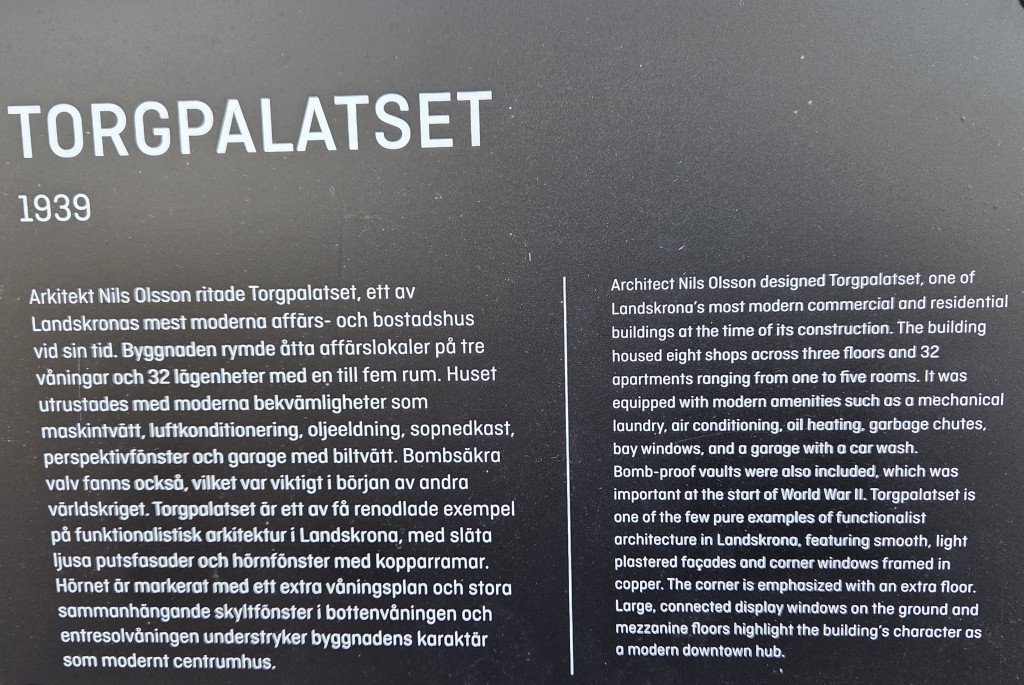 Beskrivning: "Torgpalatset" är ett av Landskronas finaste exempel på funkisarkitektur.